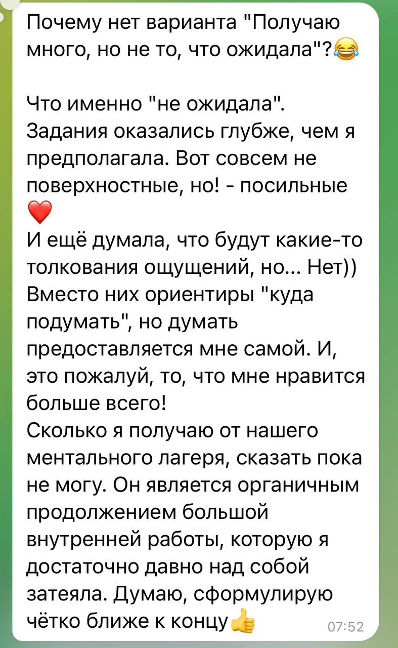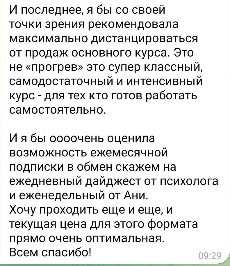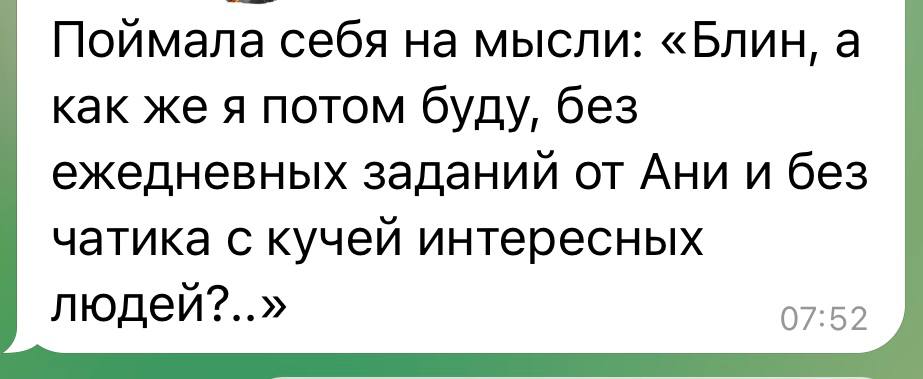 Сразу после оплаты вы станете участником чата, где будет возможность общаться с другими участниками и наставником-психологом, которому можно будет задавать вопросы
